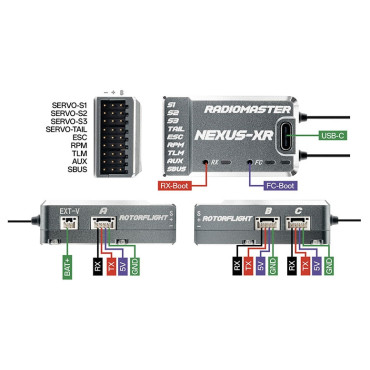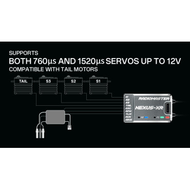FC RadioMaster Nexus-XR Helicopter with receiver Blue The Nexus-XR revolutionizes helicopter flight controllers by integrating a cutting-edge ExpressLRS receiver with dual Semtech SX1281 2.4GHz transceivers. This built-in receiver delivers exceptional RF performance, superior range, reliability, and effortless setup. It eliminates the need for external receivers, simplifying installation and reducing weight. At the core of the Nexus-XR is the powerful STM32F722 MCU, paired with the ICM42688P 6-axis MEMS motion-tracking device. This device provides excellent vibration resistance and enhanced signal rejection, making it ideal for electric and nitro helicopters. The Nexus-XR features several key upgrades. An improved BEC delivers more stable power to electronics, enhancing reliability, while the external voltage input now supports a range of 3.6V to 70V. Memory has been upgraded to 256MB, enabling longer flight logs. The CNC-machined aluminum case is sleeker yet still serves as a protective shield and heat sink, keeping the system cool during intense flights. Designed for ultimate convenience, the Nexus-XR’s compact, rugged build fits a wide range of helicopter sizes, and delivers top performance in demanding conditions. Features: - Integrated ExpressLRS Receiver: Dual Semtech SX1281 2.4GHz transceivers for seamless RF performance, eliminating the need for an external receiver. - Optimized for Rotorflight 2.2: Engineered for peak performance and compatibility. - Precision Control: STM32F722 MCU and ICM42688P 6-axis gyroscope/accelerometer for superior flight dynamics. - Flight Logging: 256MB onboard flash memory for detailed logging and tuning. - Dual Antenna Design: Two 65mm wire antennae for superior signal strength and range. - Versatile Connectivity: Multiple UART ports support CRSF, ELRS, S.BUS, and more. - More PWM Pins: Additional pins for expanded control in complex setups. - CNC-Machined Aluminum Case: Sleek, rugged design doubles as a heat sink to keep the system cool. - Tail Servo/ESC Support: Compatible with 760μs/1520μs tail servos and ESCs. - 12V Servo Support: Capable of supporting 12-volt servos. - Wide Voltage Range: Supports 3.6V–70V external power input for flexible setups. - Improved BEC: Stable, reliable power delivery to electronics for enhanced performance. - Isolated Power Supplies: Dedicated 1.8V (gyro), 3.3V (MCU), and 5V (interfaces) to minimize noise. - USB-C Accessibility: Lightweight, flexible USB-C extender cable for easy access in tight builds. - Compact and Lightweight: Ideal for any helicopter builds. - Rotorflight Rescue: Standard feature for enhanced safety in emergencies. - Case Color: Blue Specifications: Item: Nexus-XR Helicopter Flight Controller Firmware: Rotorflight 2.2 MCU: STM32F722RET6 Gyro (IMU): ICM42688P Flash Memory (Black Box. IC): 256MB (W25N02KVZEIR) Barometer: SPL06-001 Uart: 5 - S.BUS[UART1], TELEM[UART2], PORT-A[UART4], PORT-B[UART6], PORT-C[UART3] Servo: S1, S2, S3, TAIL Servos (Up to 12V ) Rpm Sensor: 1 - FROM ESC FREQUENCY SENSOR AUX: 1 Ext voltage input (tele): 3.6-70v Receiver Support: CRSF, ELRS, GHOST, S.BUS, SUMD, IBUS, XBUS, EXBUS, PPM, MSP Voltage Supply(DC): 5 - 16V A-B-C Serial Port Power Output: 5V - 1.5A Telemetry: S.BUS, HoTT, S.Port, MSP, EDGETX, ELRS ESC: PWM, Oneshot, Multishot, Dshot Support Tail ESC: 760μs / 1520μs Servo Support Tail Motor: Yes Internal Receiver: RP4TD-M ExpressLRS 2.4GHz Mini True Diversity Receiver MCU: ESP32 Type: ISM RF Chip: SX1281 x 2 Antenna: 65mm 2.4GHz Wire Antenna x 2 Frequency Range: 2.4GHz Maximum Refresh Rate: 500Hz / F1000Hz Telemetry RF Power: Max 2x10mW Wifi Updates: Yes FW Target: RadioMaster RP4TD-M 2400 RX Bus interface: CRSF Demensions: 44.70x26.50x14.30mm Weight: 24.1g Package includes: 1x NEXUS-XR Helicopter Flight Controller 3x JST-GH 4 Wire pigtail cables 1x JST-GH to Servo Plug (dupont 3 pin connector) 1x Ultra light-weight and flexible USB-C extender 1x Type C extension cable 1x JST-ZH1.5 "DSM" Telemetry cable (Telemetry only does not support DSM Receivers) 1x Voltage telemetry wire 3x 3M double-sided mounting tape 2x Heat shrink tubing 1x Inventory Card
